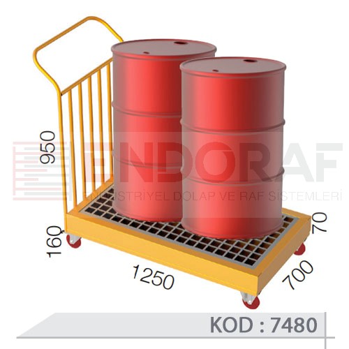 Kimyasal varil taşıma arabası ergonomik itme kulpu sayesinde rahat hareket edebilme özelliğine sahiptir. Kimyasal varil taşıma arabası zemini 40x40x2 mm profilden şase içerisinde 2 mm sac havuzludur. Havuz 40 litre taşıma kapasiteleridir, havuz içerisinde perfore sacdan ızgara , sıvı tahliyesi içinde 1 adet maşon mevcuttur. Kimyasal varil taşıma arabası içinde; 2 adet sabit, 1 adet dönerli, 1 adet dönerli frenli olmak üzere 125 mm çapında polyemid tekerlekler kullanılmaktadır.
